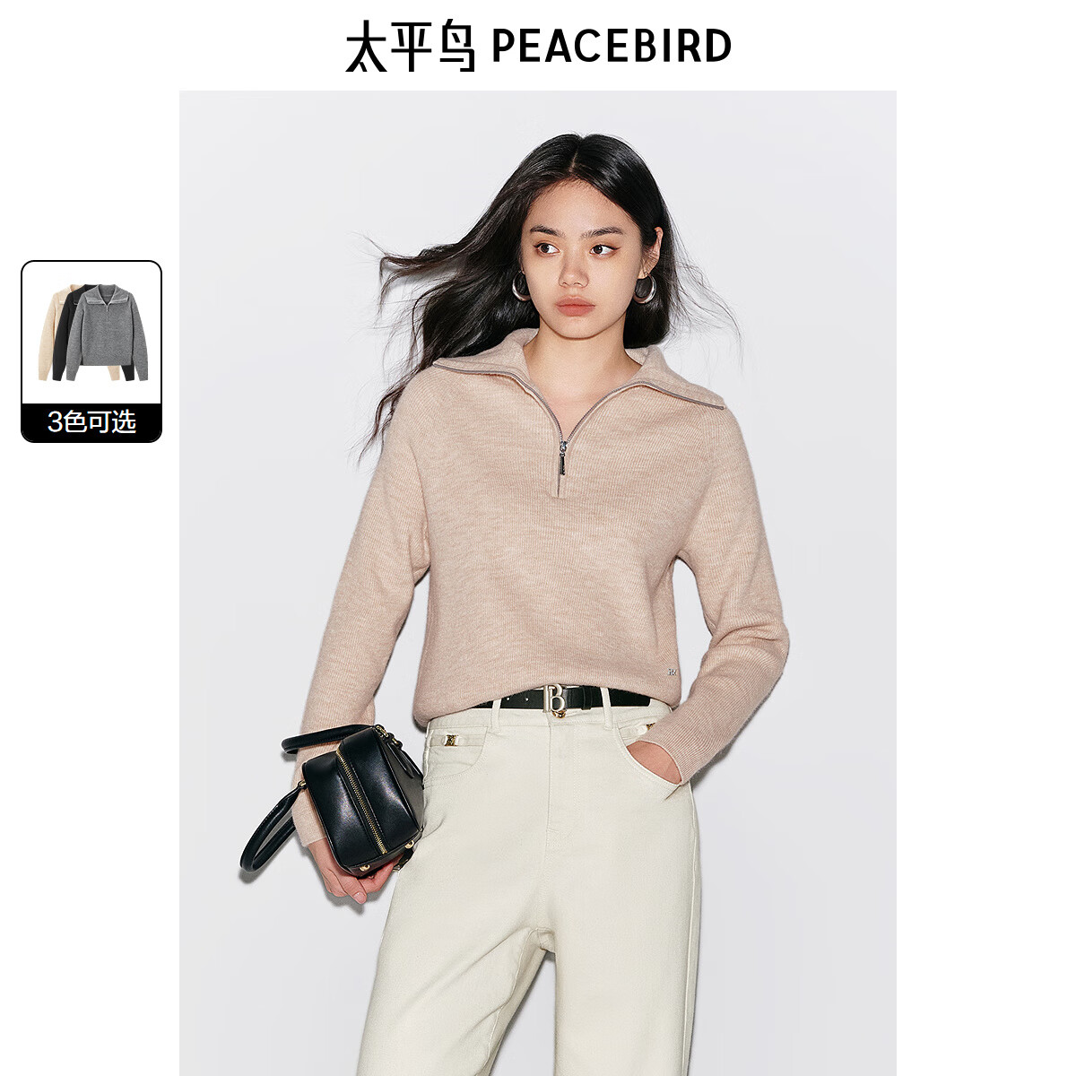 ¥299 太平鸟秋冬毛针织衫集合链接新款打底无缝套衫女士开衫 米色半门襟翻领线套衫 M 399