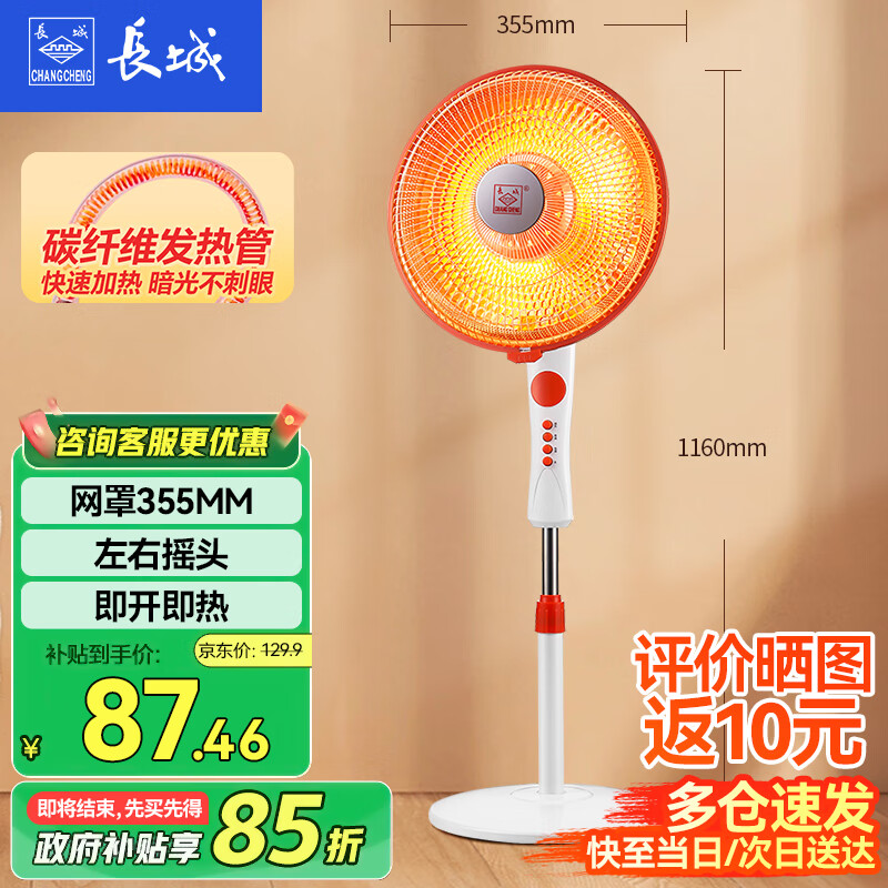 ¥79.9 长城(CHANGCHENG)取暖器家用小太阳电暖器轻音电暖气取暖烤火炉台式电热两档调节速热倾倒断电 落地中号摇头款机械式LX-01/360 122.9