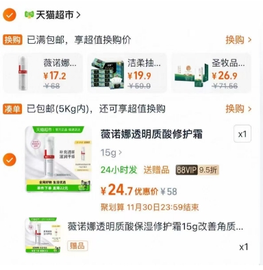 在售价68元,领8元券,叠满减+88VIP,实付低至24.7元包邮,参考平时正装30g要150+;