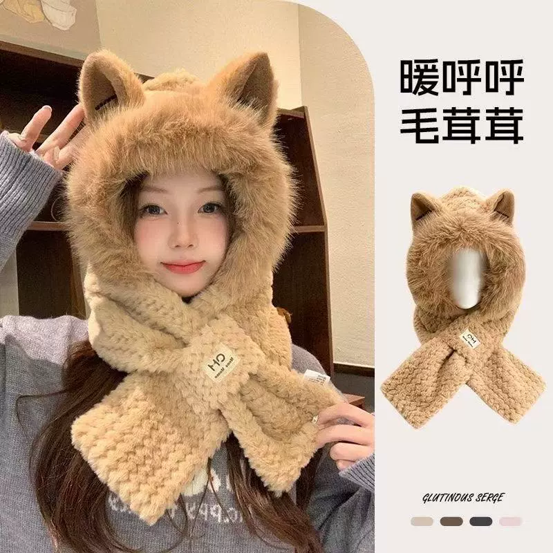 ¥9.9 秋冬季可爱围巾加厚一体围脖毛绒保暖护耳帽 39.9