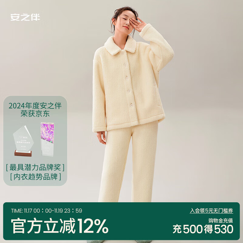 ¥99 安之伴睡衣女秋冬加厚北羔绒暖暖简约纯色休闲女士家居服套装可外穿 浅黄 M 129