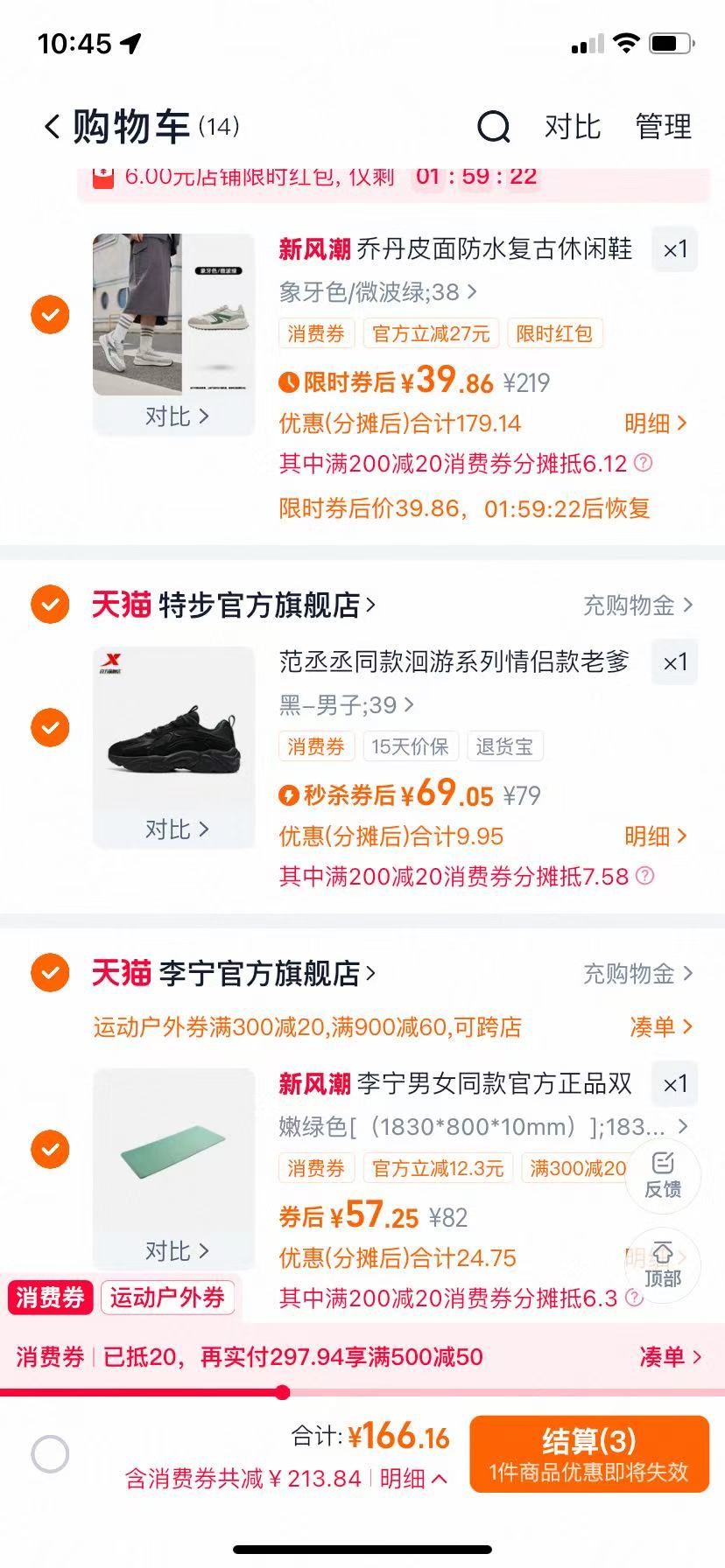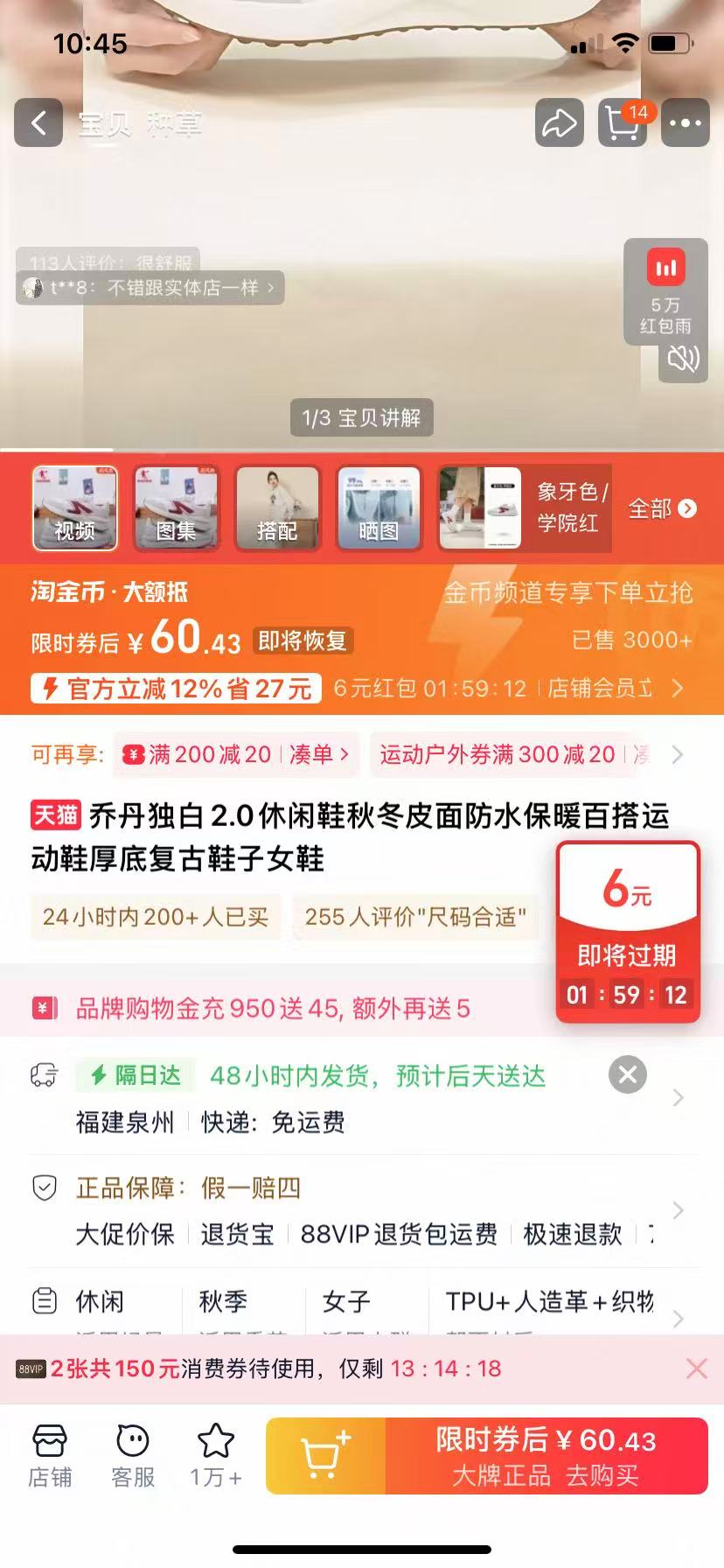 在售价219元,领93元券+8.9元礼金,商品页弹限时随机红包,商品页右上角三个点点进去-底部淘金币点进去加购1件,叠凑单2款一起,叠淘金币+88VIP消费券,折主商品39元!