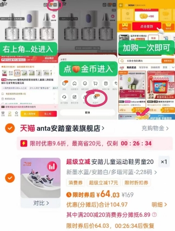 在售价169元,领62元券,商品页右上角三个点进去-底部淘金币点进去-淘金币 我的足迹页加购,叠凑单4件,叠淘金币+88VIP9折消费券,折主商品64元;