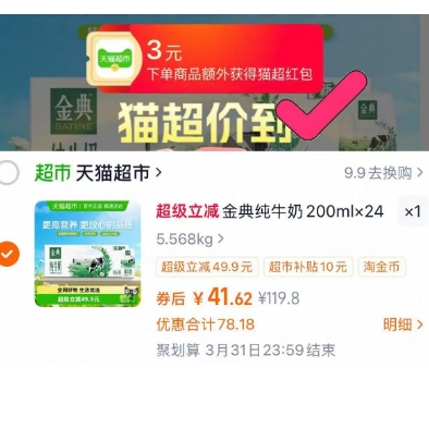 金典纯牛奶200ml*24盒,叠加红包后低至1.5元/盒