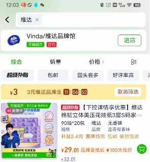 1、手淘-猫超搜:维达 部分有3元品牌金