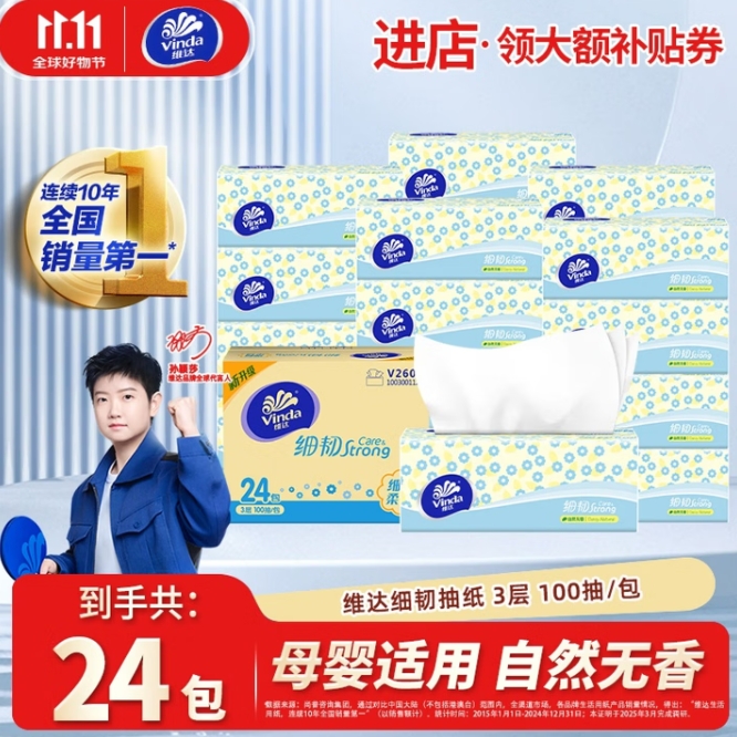 66元包邮!维达 细韧抽纸 得100抽*72包