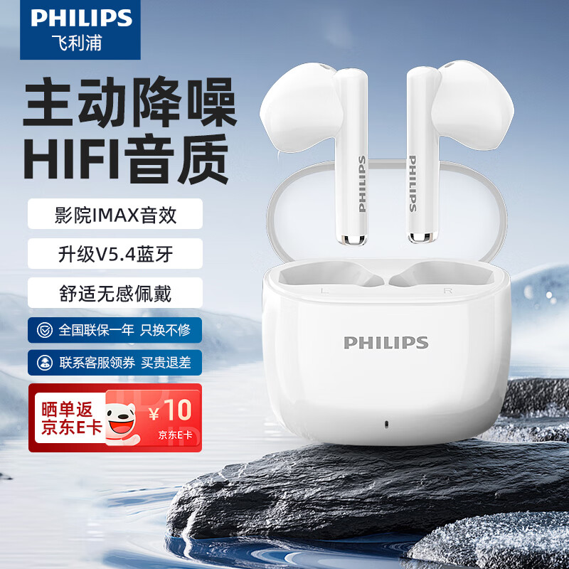 ¥69 飞利浦(PHILIPS)无线蓝牙耳机真无线耳机HiFi音质AI通话降噪入耳式蓝牙耳机超长续航大电量超强降噪运动 白色 199