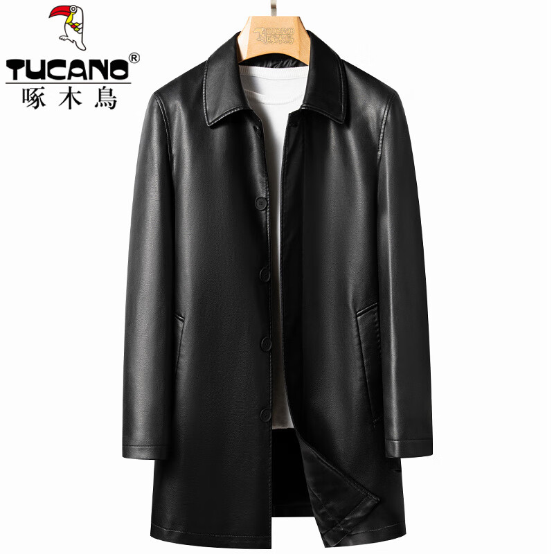 ¥238 啄木鸟(TUCANO)真皮皮衣男士皮风衣中长款皮夹克休闲中年爸爸装特大码外套 黑色【中长款】 L 175建议115-130斤 338