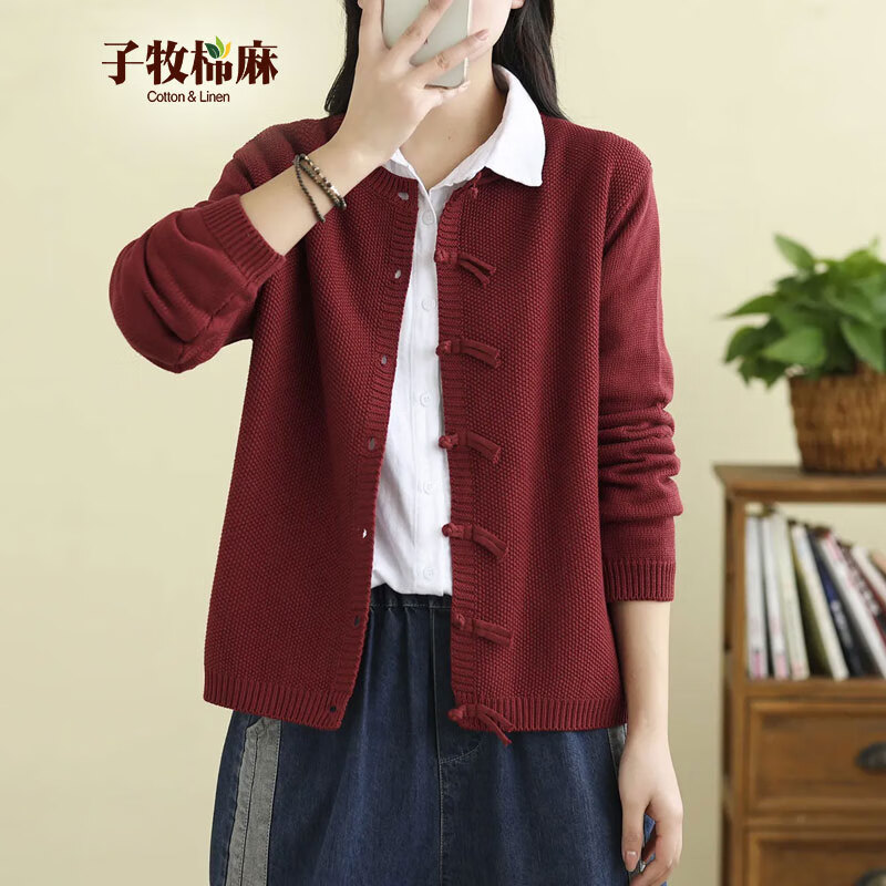 ¥59 子牧棉麻秋装 女新中式盘扣外套宽松长袖百搭圆领针织开衫上衣5637 红色 均码(建议95-140斤) 89