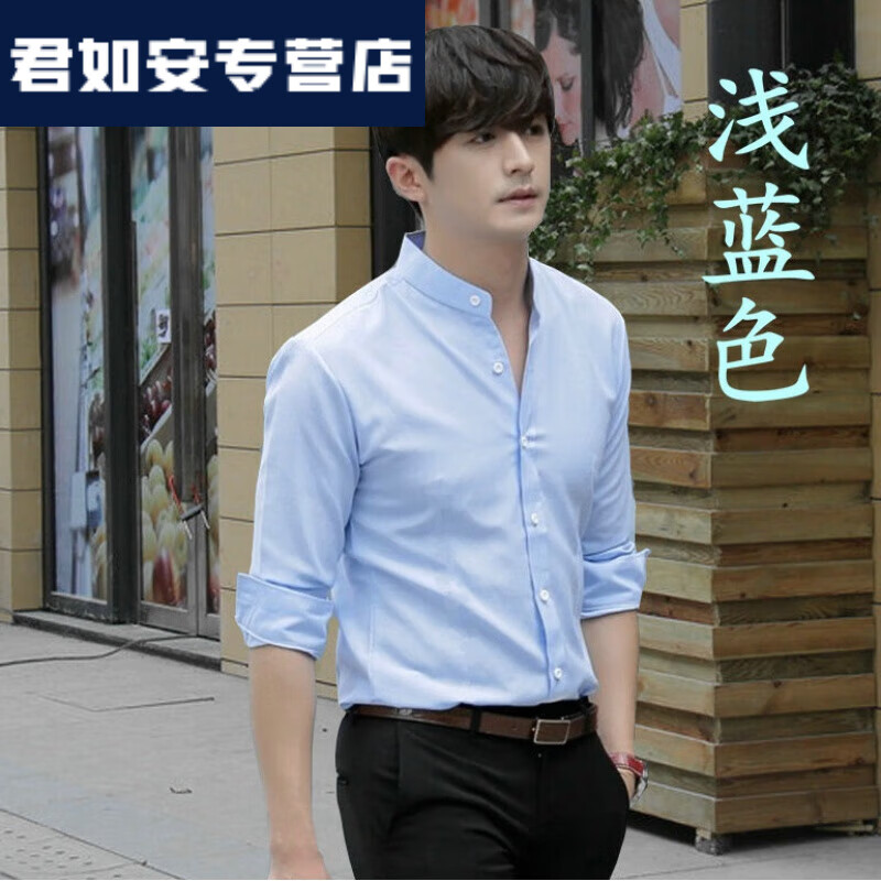 ¥107 瑜放中华小立领衬衫男长袖商务圆领中山装纯衬衣修身休闲免烫纯色 浅蓝色 37 117