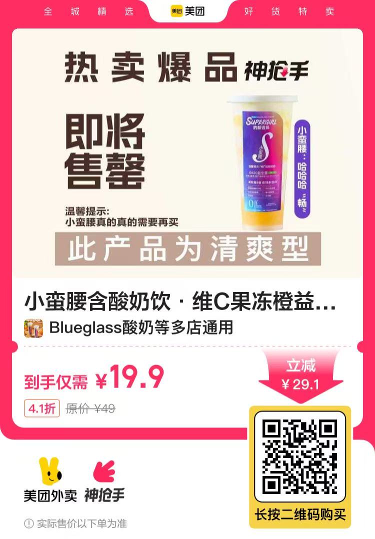 【美团外卖】19.9元!Blueglass酸奶|维C果冻橙益生元味