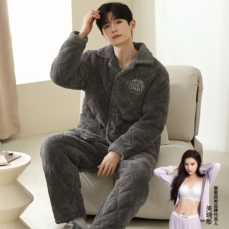 ¥89 香蜜闺秀【三层夹棉加厚】男士睡衣秋冬新款长袖可外穿保暖男士家居服套装 W3424013深灰 2XL 289