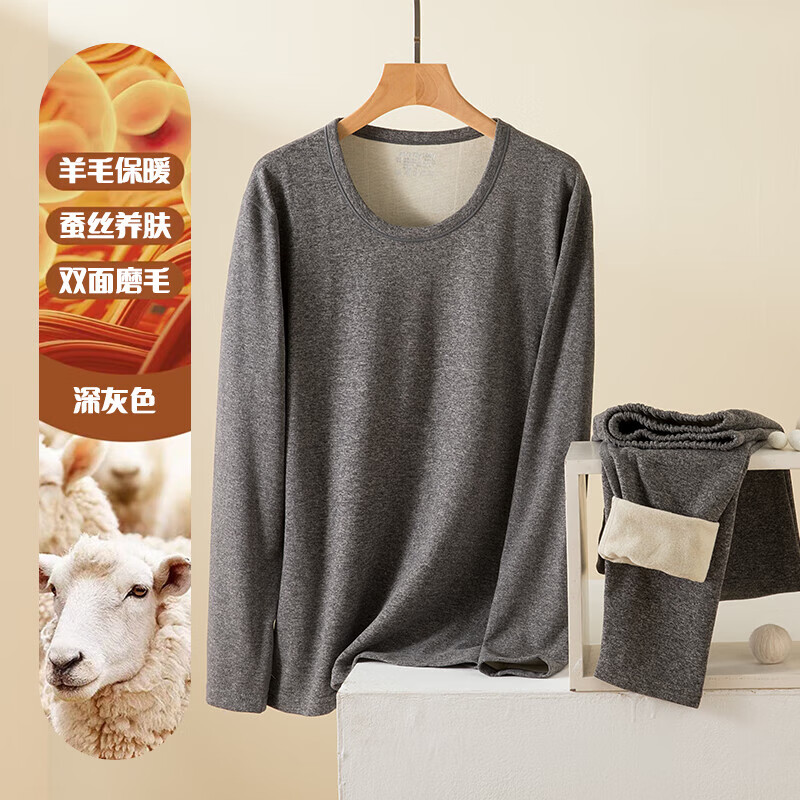 ¥69.9 宜而爽【含山羊绒蚕丝】7A抑菌防螨保暖内衣套装无痕磨绒圆领秋衣秋裤男 男款-铁灰 XL (男175/女170) 99.9