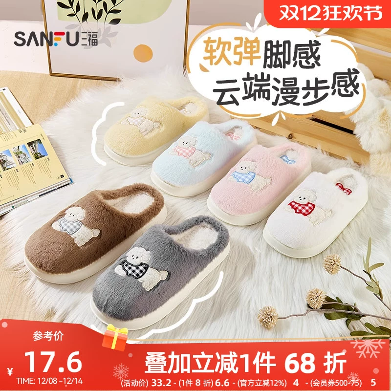 ¥19.56 三福情侣室内家居毛绒棉拖鞋 22.56