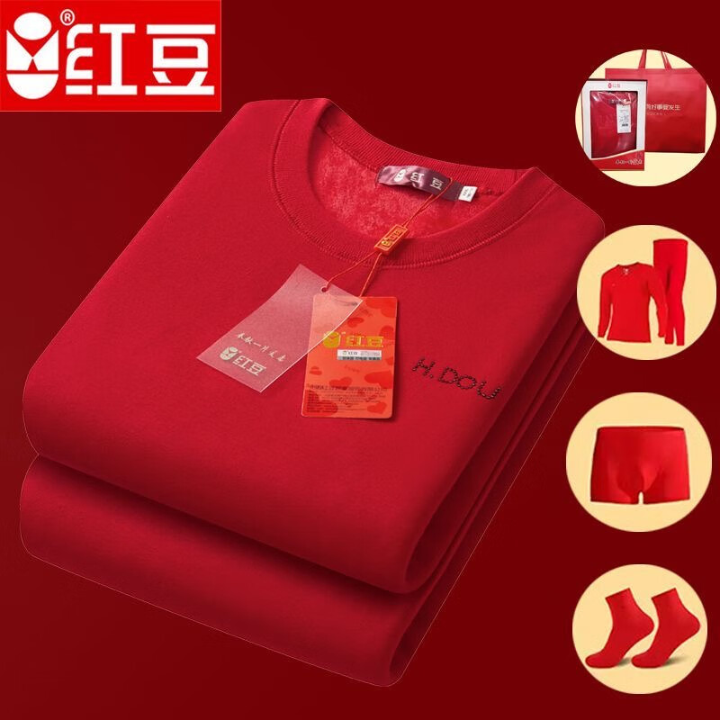 ¥148 红豆本命年属马大红色保暖内衣套装加绒加厚男女结婚喜庆蛇年内衣礼盒 男士圆领大红色+内裤+袜子 XL /170 178