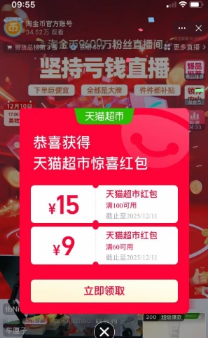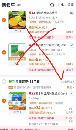 活动售价92.9元,参与立减33元优惠活动,天猫超市首页-超级补贴减0.9元,领天猫超市99-10优惠券,凑单三件单品(橙子1斤加2件超级补贴加入购物车,绿豆1件),淘金币直播间领60-9红包(停留几秒,见截图2弹出),叠加88会员主商品实付34.91元包邮。