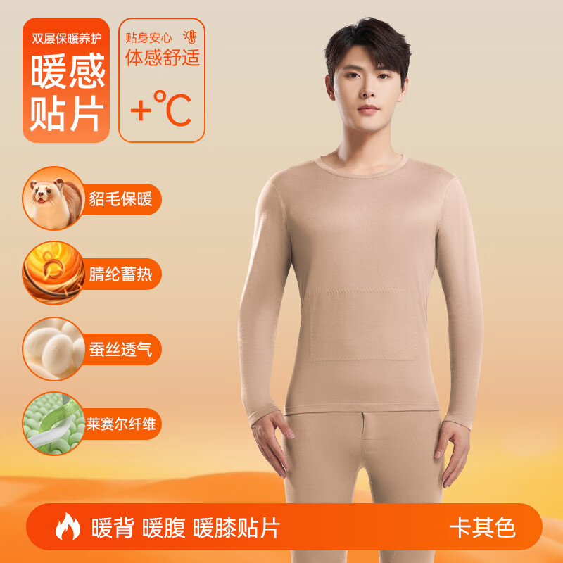 ¥39.9 鸭鸭男士天然蚕丝貂毛保暖内衣男秋冬季防寒发热加绒加厚秋衣秋裤套装 卡其色 XL 建议【120-140斤】 139.9