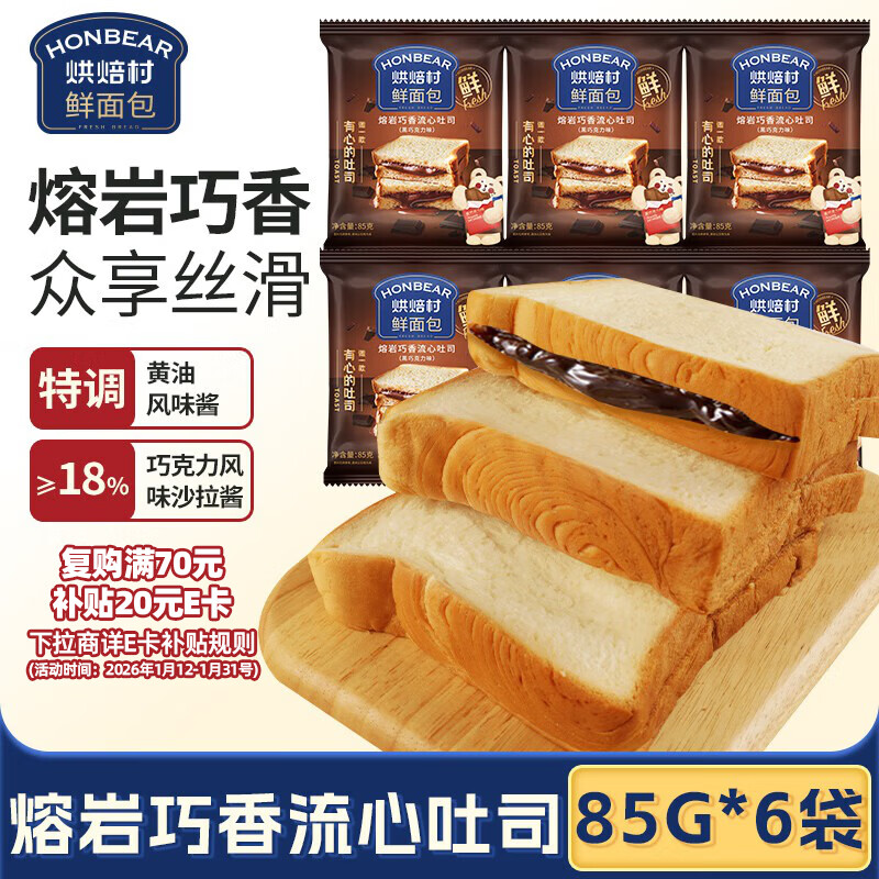 烘焙村熔岩巧香流心吐司黑巧克力味85g*6袋 4.99元
