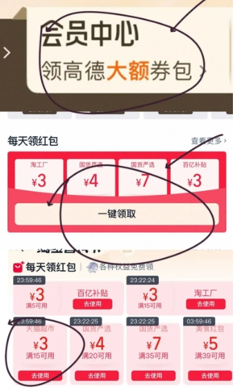 1、淘宝App-我的淘宝-上方会员中心-领15-3元券;