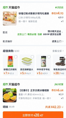 活动售价29.9元,领1减1元优惠券,领价格下方超市49-5元券,有3元福袋,立减17元优惠活动,价格下拉详情页-超级补贴折上折点进去加购主商品+凑单2款,叠15-3元券(徐福记、橙子从“超级补贴”加入购物车才能用),88会员实付折4.93元到手徐福记。(或不加橙子,徐福记1件、调味料1件,从“超级补贴”加入购物车才能用,徐福记实付4.97元包邮)部分地区有货。