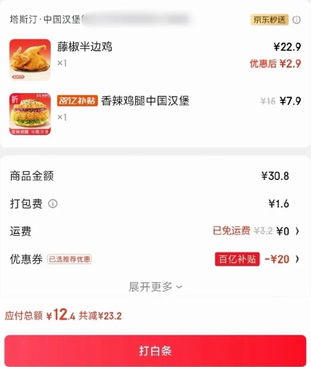 叠加20-17百补券,百补香辣鸡腿堡+藤椒半边鸡