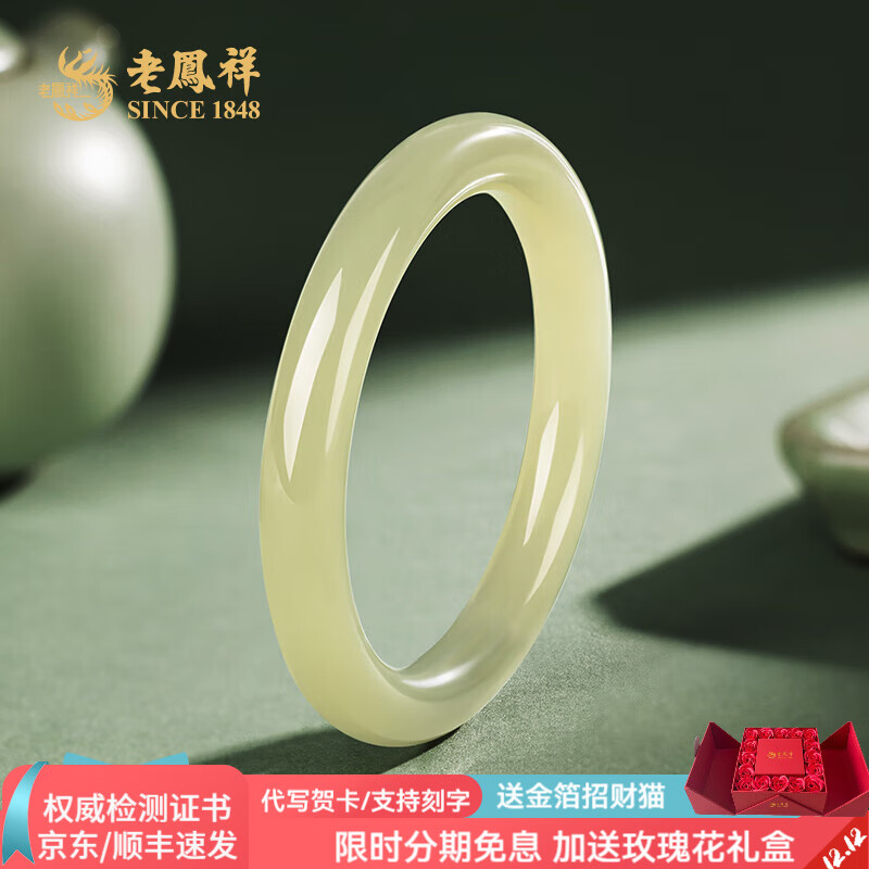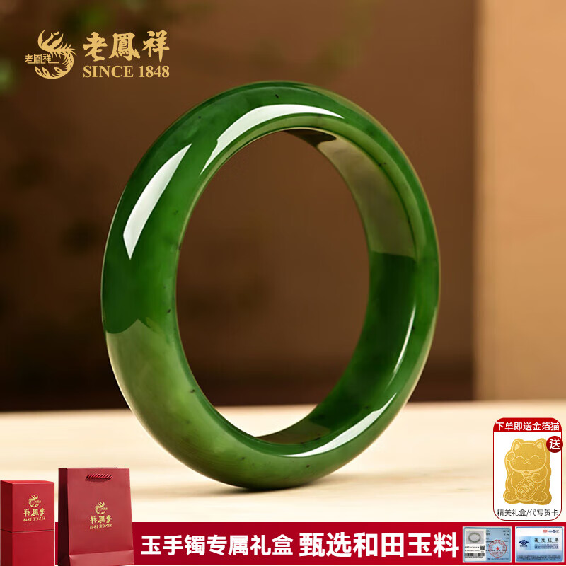 ¥1429 老凤祥碧绿和田玉手镯碧玉平安镯宽版玉镯手镯送女友老婆玉类首饰 62#和田玉碧绿手镯 1449