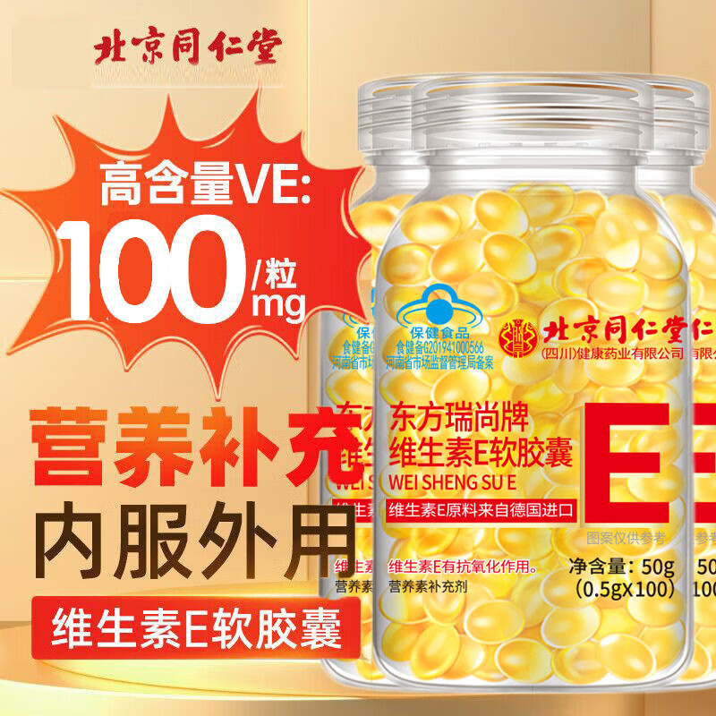 ¥49 维生素e软胶囊 维e胶囊 ve维生素女性维生素内服外用 A 北京同仁堂维生素E100粒*3瓶 119