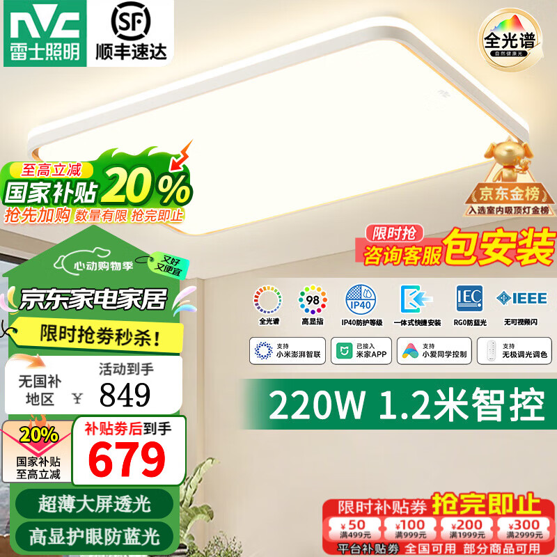 ¥799 雷士(NVC)大尺寸约1.2米客厅主灯LED吸顶灯卧室智能灯具2025款全光谱护眼S 220W 35㎡内适用 10641lm 智能-悦晨 849