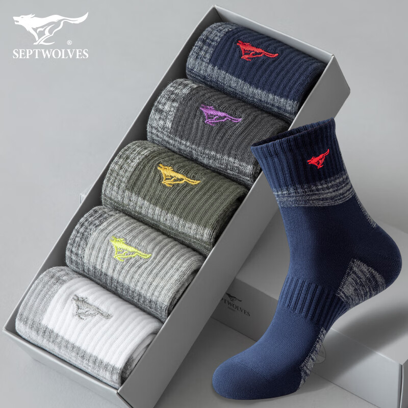 ¥59.9 七匹狼袜子男纯棉秋冬季休闲长袜吸汗透气商务袜时尚运动风棉袜 纯棉偏厚款运动袜 混色 5双 79.9