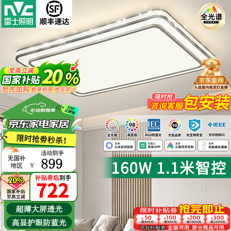 ¥849 雷士(NVC)全光谱智能护眼大尺寸吸顶灯具2025流行客厅卧室餐厅套餐国家补贴 160W 30㎡内适用 5445lm 智能-晶宏 899