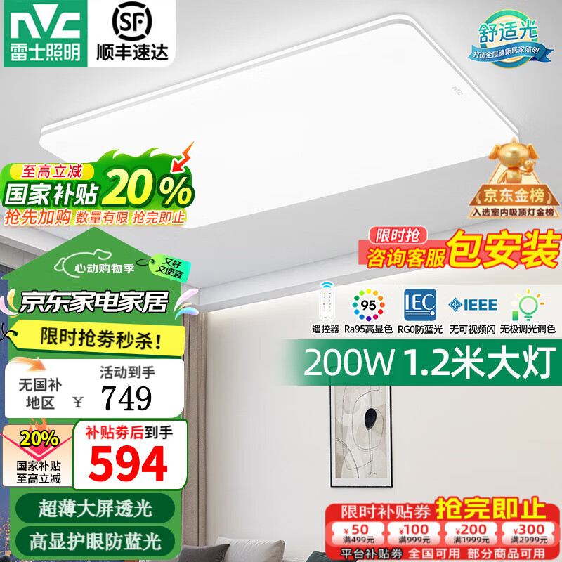 ¥699 雷士(NVC)客厅灯约1.2米北欧现代简约超薄led吸顶灯卧灯饰灯具室2025流行款 超薄大屏银光鸿-200瓦/无极调光 749