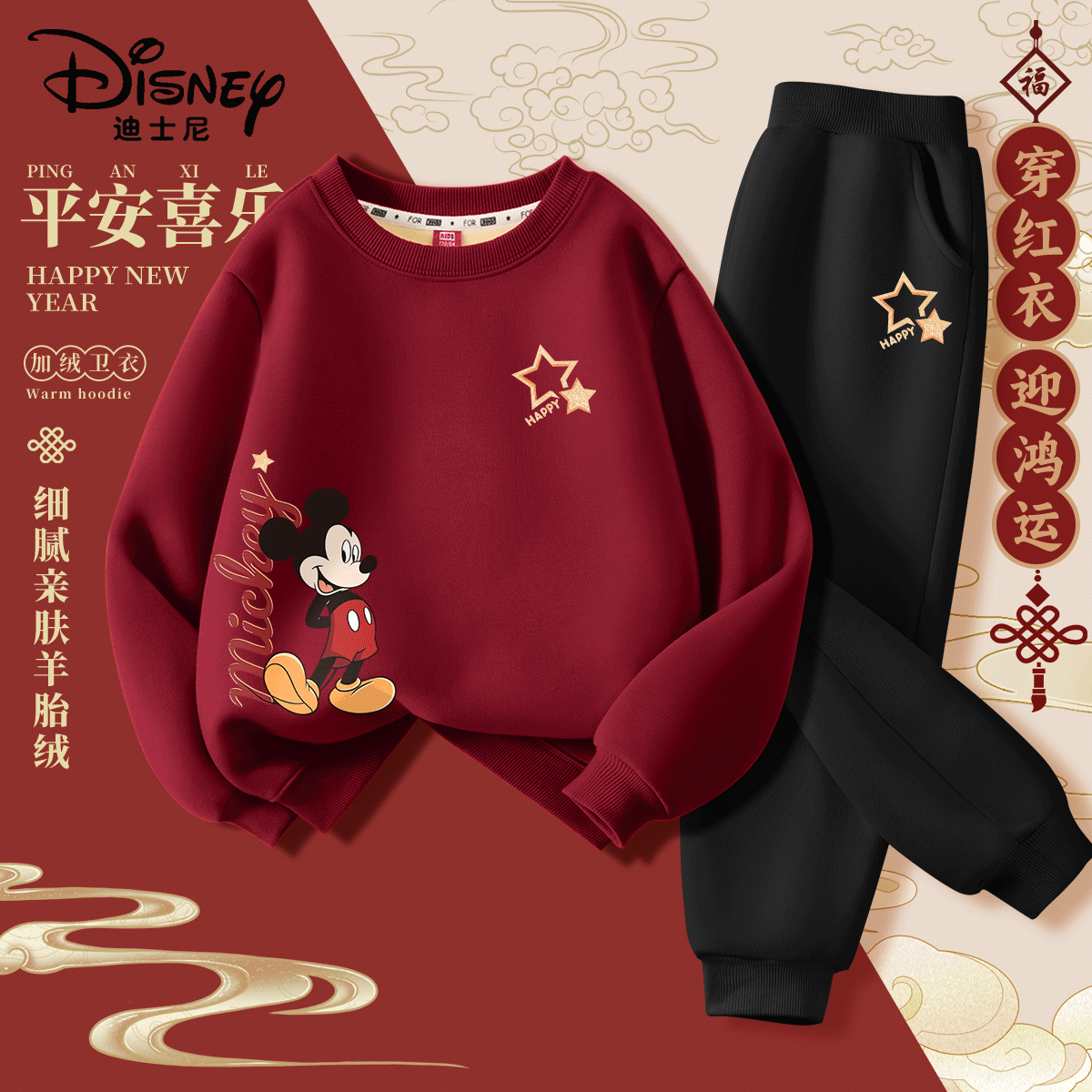 ¥97.9 迪士尼(Disney)童装【节日限定】儿童加绒卫衣套装2026新款女童拜年服男童新年服 迪拜年星奇K酒红+迪星光K黑 160 112.9