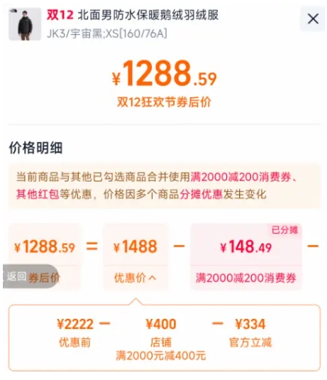 在售价2222元,可领50元淘礼金,88会员领2000-200消费券,从商品详情页左下角进店铺首页,可0.1元秒2000-400元店铺券(每天10/14/18/20点可秒),在购物车右下角消费券一栏点“凑单”,按系统推荐凑单勾选即可,下单后凑单品可T,结账实付新低1288.59元包邮白菜价,多色码全!