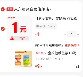 2.加购0.01元商品-购物车 右侧换购里找到金维他,付9.9元到手