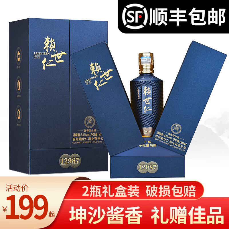 ¥169 赖世仁酱香型白酒53度贵州茅台镇坤沙酱酒节日送长辈礼品宴请酒水礼盒装 53度 500mL 2瓶 (带礼袋一个) 199