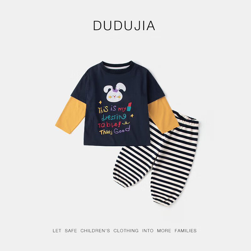 ¥109.7 嘟嘟家女童长袖套装春装女小童秋款可爱假两件T恤女宝宝休闲条纹裤子潮 藏青色 90 110.2