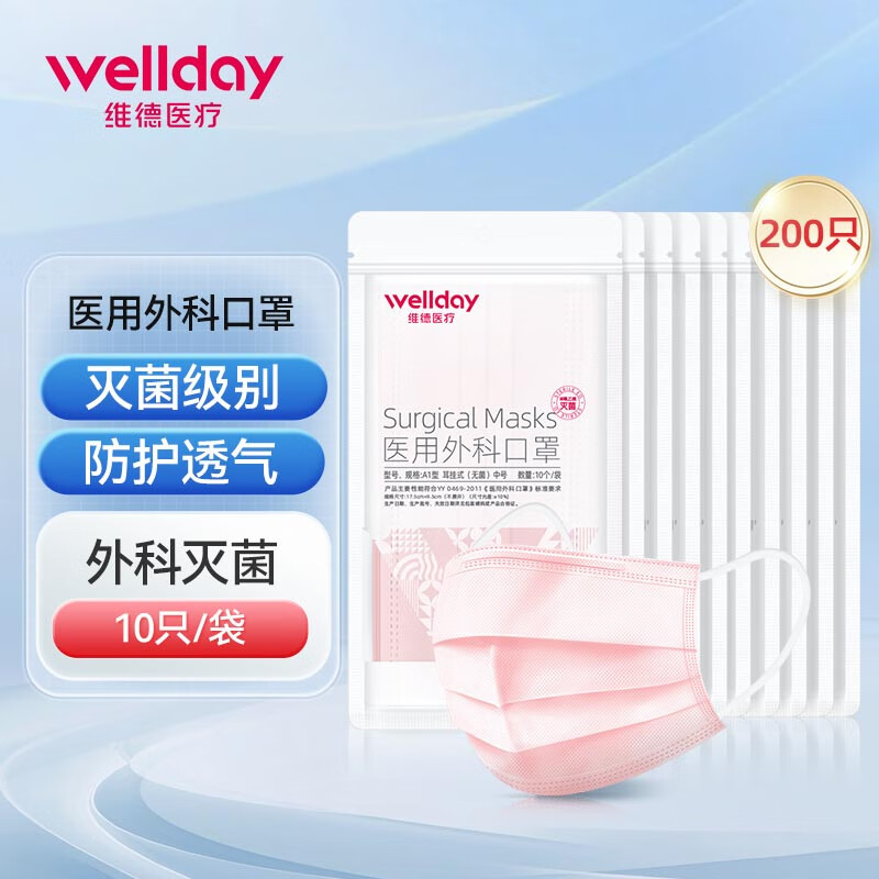 ¥32.8 维德(WELLDAY)医用外科口罩灭菌级防尘防柳絮口罩轻薄透气挂耳式保暖透气口罩 【外科灭菌粉色】200只 35.8