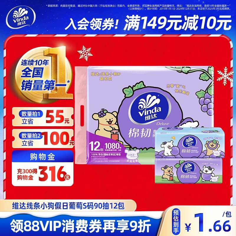 ¥17.9 维达小狗联名款葡萄香棉韧抽纸家用餐巾纸 19.9