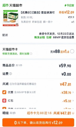 在售价59.9元,商品页右上方直播间领9折券,找到鸡蛋加购1件,商品页右上角三个点点进去-底部淘金币点进去-淘金币 我的足迹页加购1件,最后购物车修改数量1件,叠淘金币+上方红包+品牌金+88VIP,实付12.6元包邮;