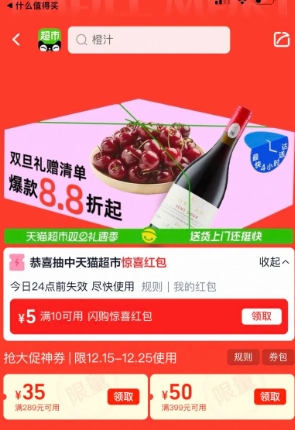 3、天猫超市首页分别搜索:臻选美食品类金、领3元品类金,以超市卡形式抵扣)