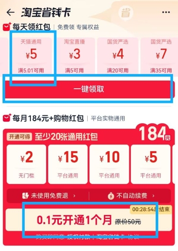 1、淘宝App-搜 省钱卡 页面有5元红包+0.1元开通领2元红包;