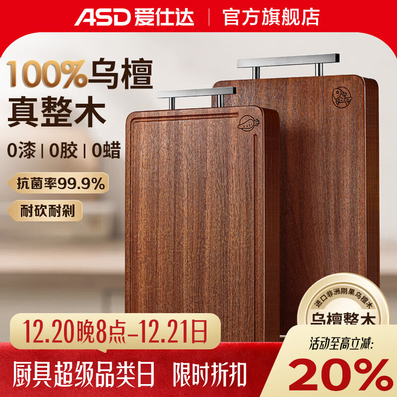 ¥88 爱仕达砧板乌檀整木菜板防霉抗菌家用实木砧板双面切菜板案板厨房专用 【99.9%抗菌】40*28*2.5cm 3-4人 108