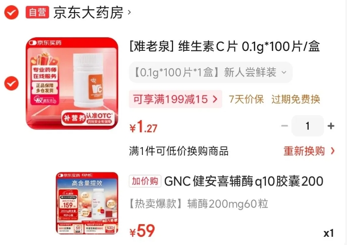 加购1件,购物车页 换购点进去,加购上方收藏健安喜辅酶,折健安喜辅酶59元到手;