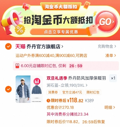 在售价389元,领96元券+24.6元礼金,下拉详情进补贴加购,叠凑单2款一起,折主商品118.8元;