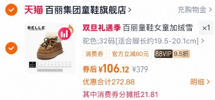 在售价379元,领100元券+49.75元礼金,商品页右上角三个点点进去-底部淘金币点进去-淘金币 我的足迹页拍,叠淘金币,叠凑单一起,折主商品106元;