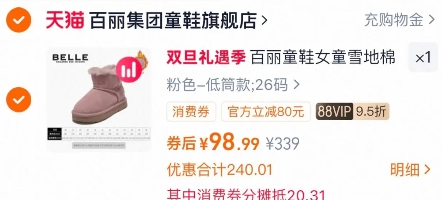 在售价339元,领80元券+44.75元礼金,商品页右上角三个点点进去-底部淘金币点进去-淘金币 我的足迹页拍,叠淘金币,叠凑单一起,折主商品98元;