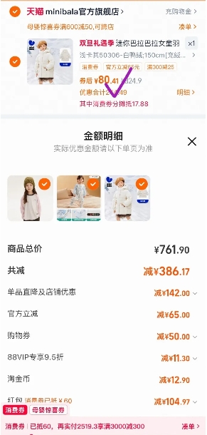 在售价324.9元,领80元券+38.72元礼金,商品页右上角三个点点进去-底部淘金币点进去-淘金币 我的足迹页拍,叠淘金币,叠凑单一起,折主商品80元;