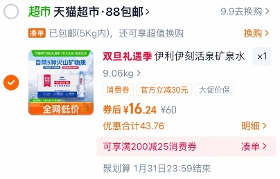 13元!伊利 活泉火山矿泉水330ml*24瓶