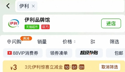 1.手淘-猫超搜:伊利 领取3元猫超卡