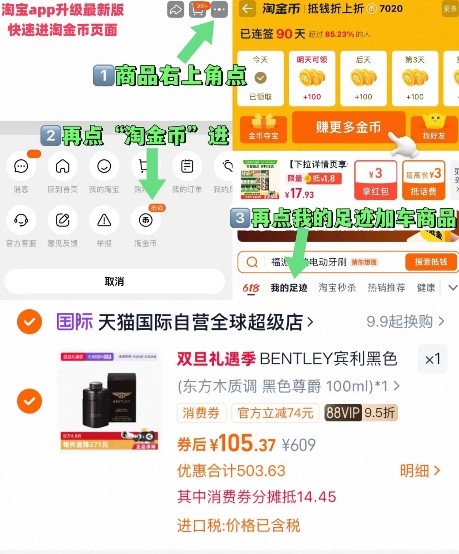 在售价609元,领120元券,商品页右上角三个点点进去-底部淘金币点进去-淘金币 我的足迹页拍,叠淘金币,叠凑单,折主商品105元;
